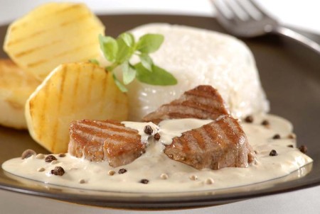 Steak au Poivre de Filé Mignon Suíno com Batatas ao Murro