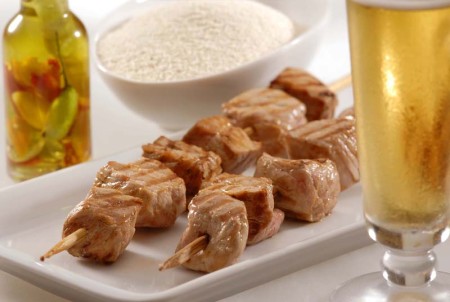 Brochete de Coxão Mole Suíno com Farofa de Baru e Bacon e Molho Barbecue